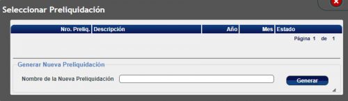 Primero se deberá crear una nueva Preliquidación con la opción del botón Preliquidación acompañado de una flecha azul hacia arriba. Después de completar el nombre que identifique a la preliquidacion, hacer clic en el botón Generar: